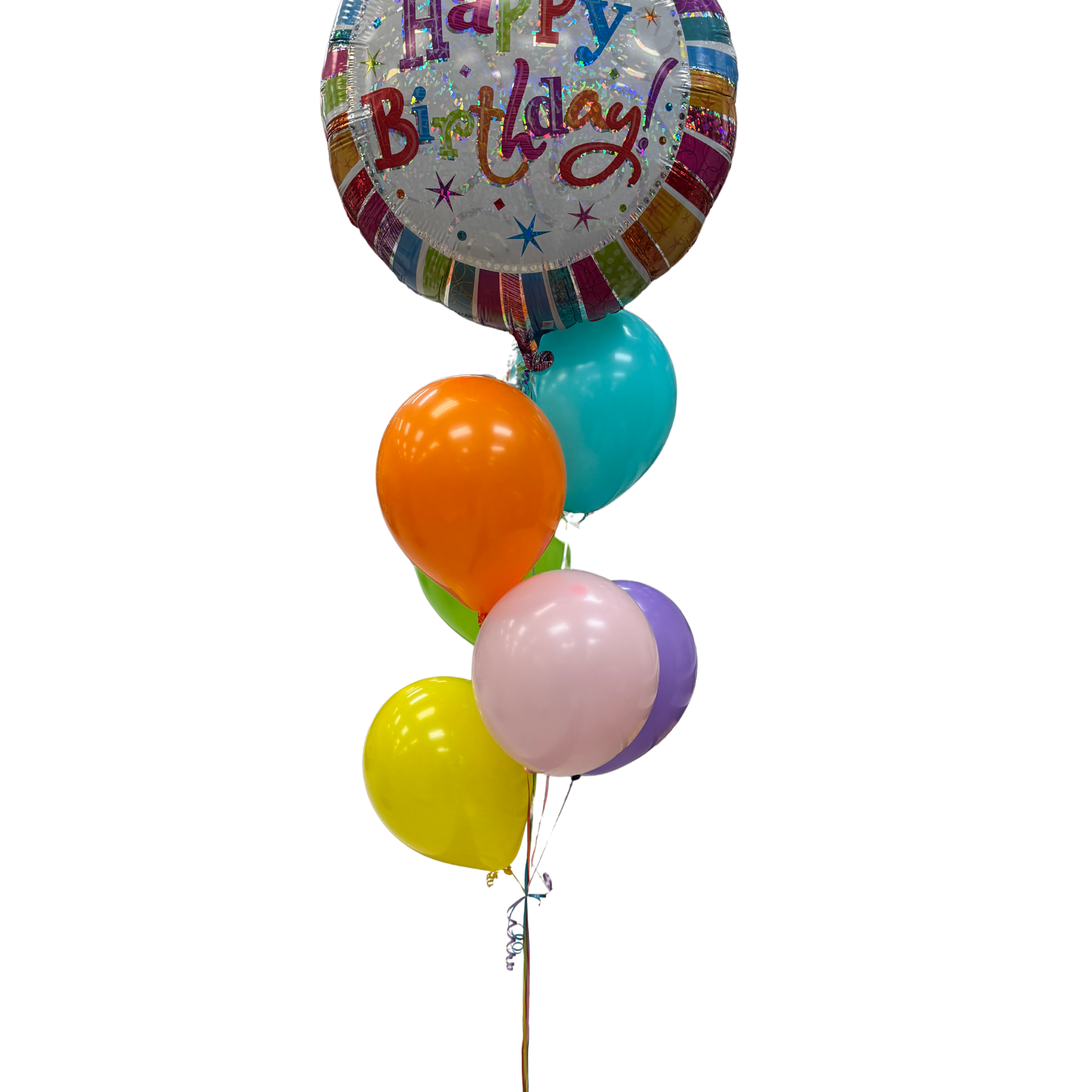 Standard Birthday Balloon Bouquet - Two 18 inch Birthday Foils and Six 11 inch Latex Balloons with Hi-Float (In-Store Pick Up ONLY)
