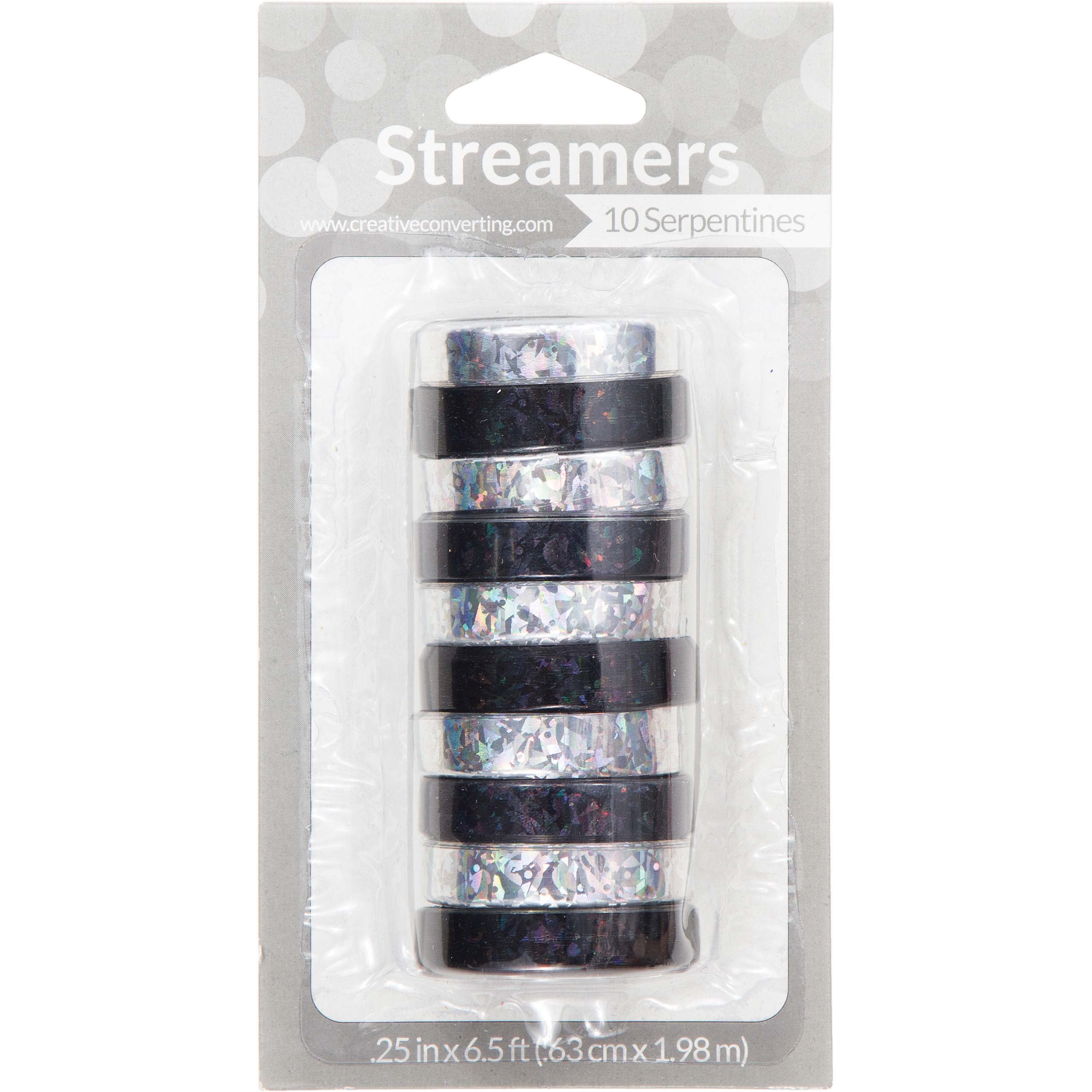 Add instant sparkle and drama to your party with our Silver and Black Holographic Serpentine from Creative Converting. These eye-catching metallic streamers are perfect for New Year’s Eve parties, graduations, birthdays, and black-tie celebrations, creating a dazzling effect as they shimmer under the light.