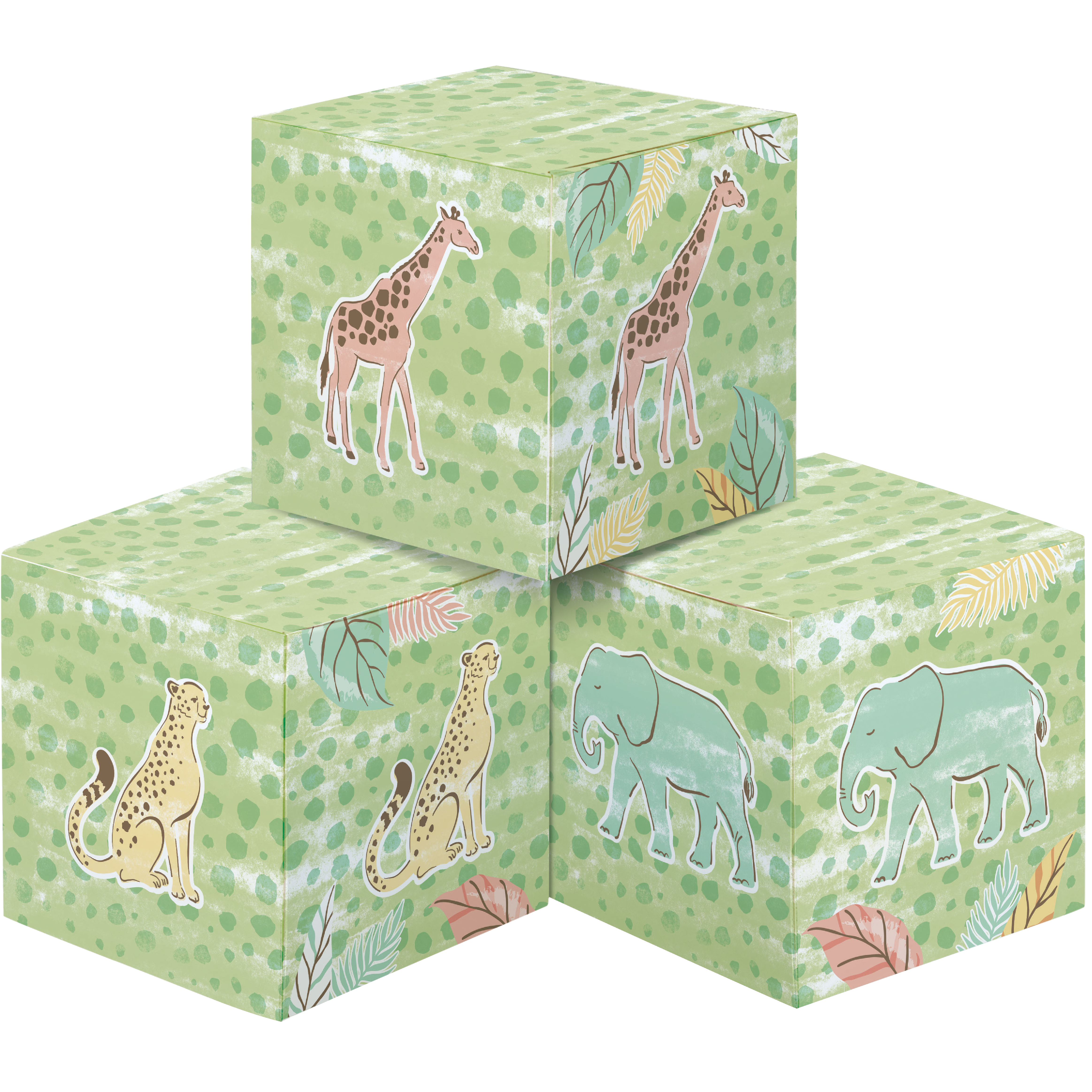 Featuring playful giraffe, lion, elephant, and zebra artwork in soft, gender-neutral colors, this centerpiece adds instant charm to dessert tables, gift tables, or party centerpieces—no assembly stress required.