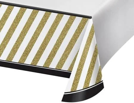 Set the stage for a glamorous celebration with the Black & Gold Tablecover by Creative Converting! Measuring 54" x 108", this elegant disposable tablecover is the perfect backdrop for birthdays, anniversaries, graduations, New Year’s parties, cocktail nights, and any event that calls for a touch of sophistication.