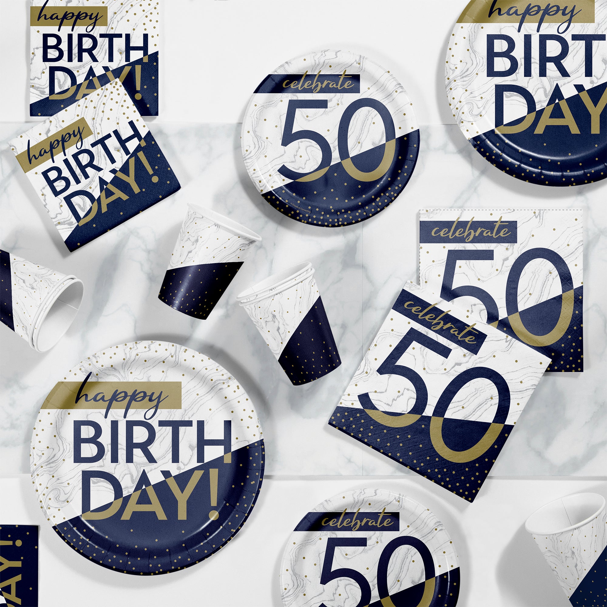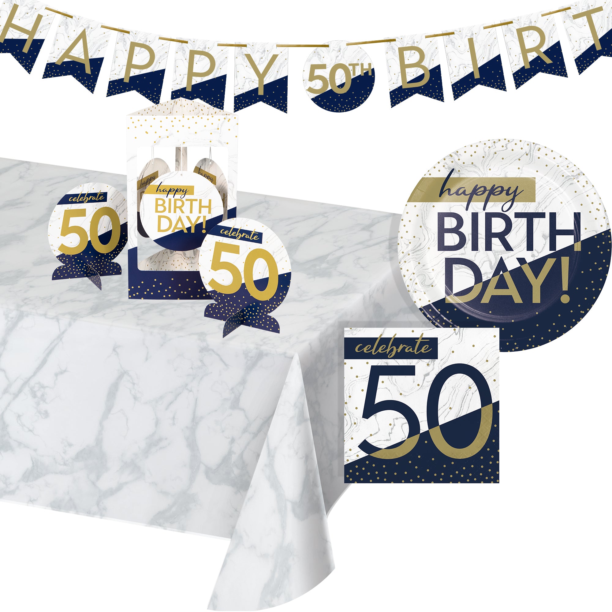 Coordinates with other Navy & Gold 50th party supplies