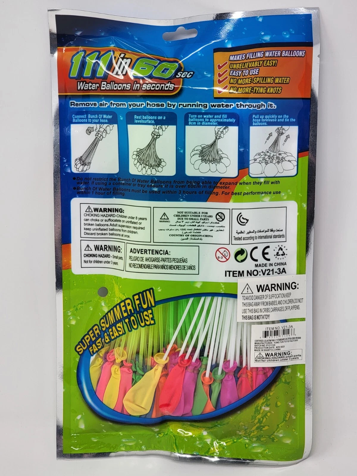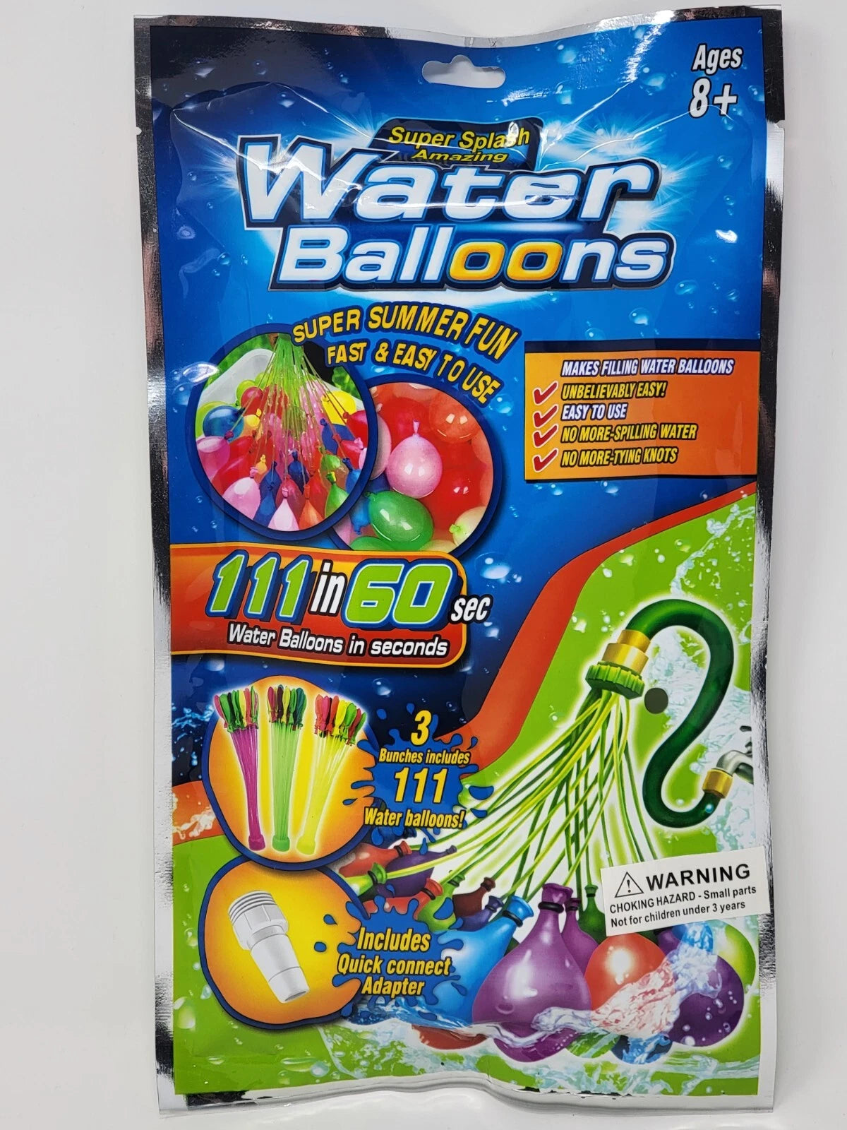 The Super Splash Amazing Water Balloon Fill Kit lets you fill 111 water balloons in seconds — all at once! Just hook the bunch to your garden hose, turn on the water, and watch them magically fill and self-seal. No knots. No sore fingers. No prep time.